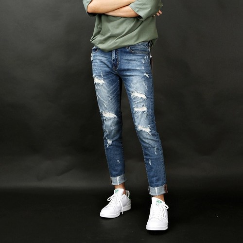 허벅스 남자 9부 디스트로이드진 크롭진 스판 진청 히든밴딩 테이퍼드핏 찢어진 청바지 찢청 컷팅진 데님 S~3XL