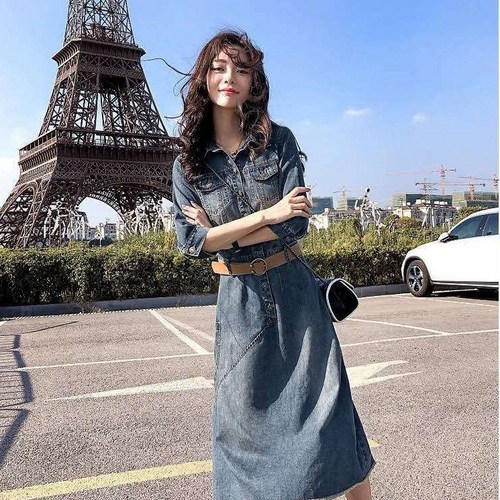 포린박스 벨트 데님 코튼 오피스 정장 트렌치 롱 원피스 YJ