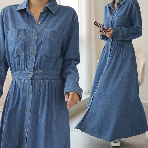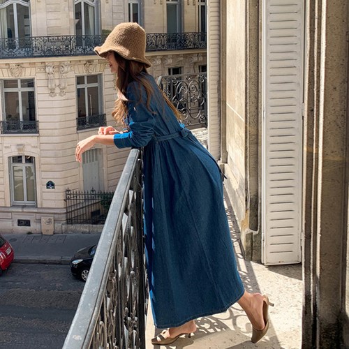 민스타일 카라 데님 허리밴딩 롱 원피스