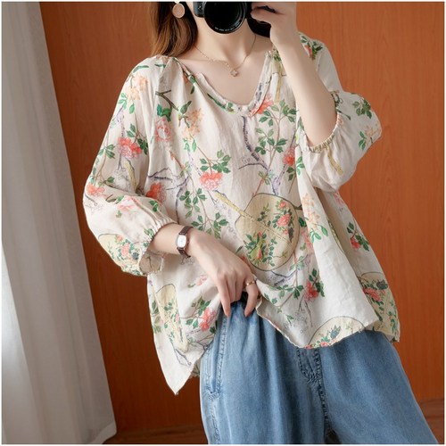 여성 여름 7부 슬리브 자수 린넨 블라우스39