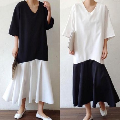 – 세련 단아 여름 루즈핏 배색 브이넥 a라인 바스락 코튼 밑단프릴원피스/블랙 화이트