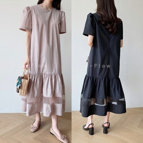 쏘쭌 바스락 원단 라운드 반팔 나일론 코튼 밑단 프릴 레이어드 고퀄 롱 원피스
