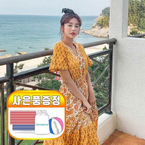 헤링본 여름 롱 비치원피스 에스닉 브이넥 반팔 루즈핏 셔링 데일리 빅사이즈 바캉스 비치웨어 휴양지룩 HC416