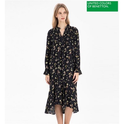 베네통 플라워 프린팅 셔링 언발란 원피스 BAOPA5841 BK