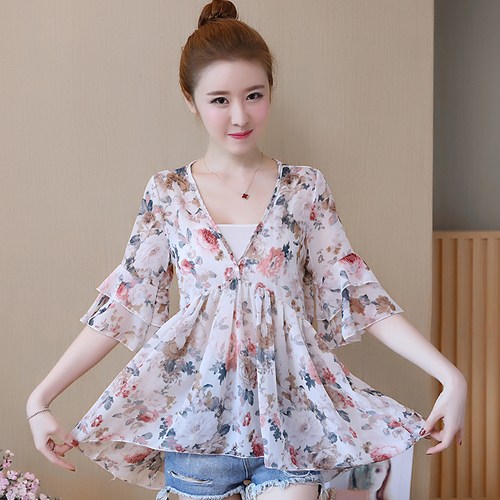 여성쉬폰블라우스 여성블라우스 쉬폰블라우스 플라워블라우스 셔츠 루즈핏 예쁜블라우스 시스루 신상빅사이즈Q01