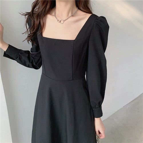 BDF 블랙 스퀘어넥 긴팔 가을 롱 고급 원피스 빅사이즈 단추 청담동며느리룩 큰옷 하객 예복 A라인 돌잔치 M부터 4XL까지
