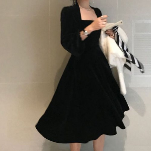 퐁순싸롱 스퀘어넥 A라인 플레어 벨벳 미디 원피스 SY
