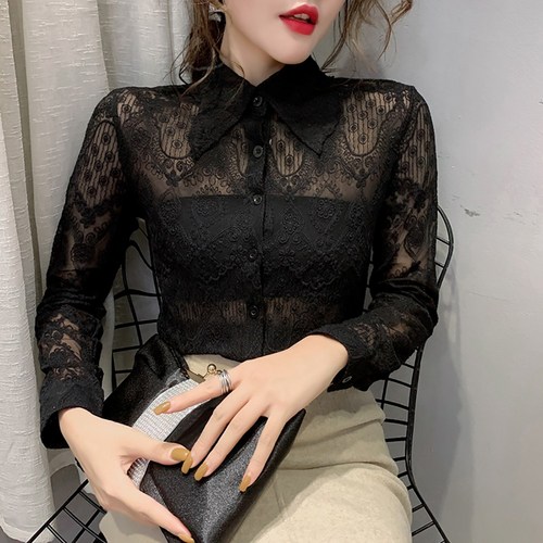 올봄 새 레이스 이너 블라우스 여 슬림 빈티지 섹시 시스루 긴팔 서양식 상의