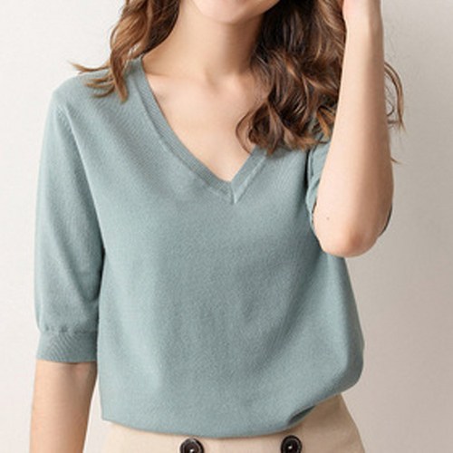 COOREENA 여성용 브이넥 니트 반팔 티셔츠