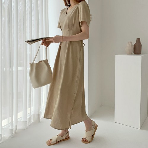메리바움 메이 린넨 브이넥 롱 원피스 허리리본 여성 간절기 반팔