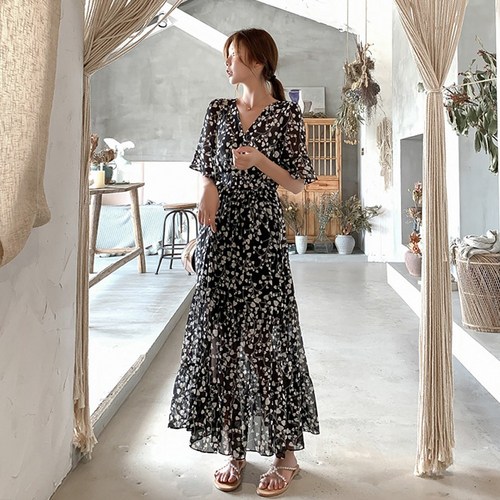 데일리앤 여름 브이넥 플라워 캡소매 프릴 롱원피스 샤닌