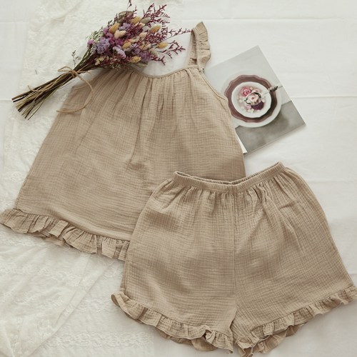 여성용 순면 모닝 요루면 프릴슬립 홈웨어 투피스 잠옷 세트