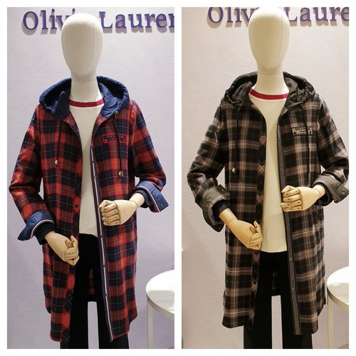 올리비아 로렌 (인기최고)체크프린트(패턴) 가을 후드 롱 남방스타일점퍼