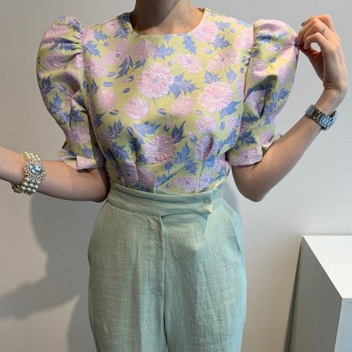 바이름 / 레타 플라워 자가드 핀턱 퍼프블라우스