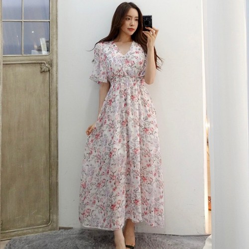 이힝 프라우 플라워 브이넥 쉬폰 롱원피스