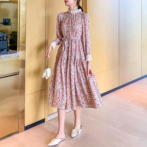르엠마 레이스 하이넥 레드 플라워 미디 간절기 롱 가을 원피스