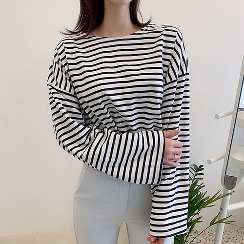 아모르데이 여성용 루즈핏 보트넥 미즈 스트라이프 긴팔 티셔츠