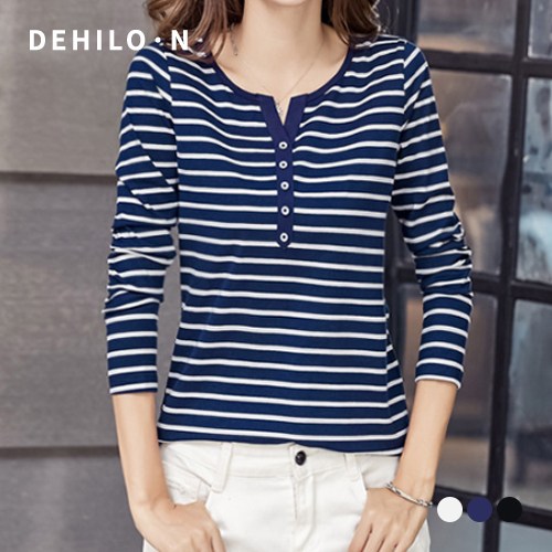 데일로엔 여성용 스트라이프 헨리넥 긴팔 티셔츠