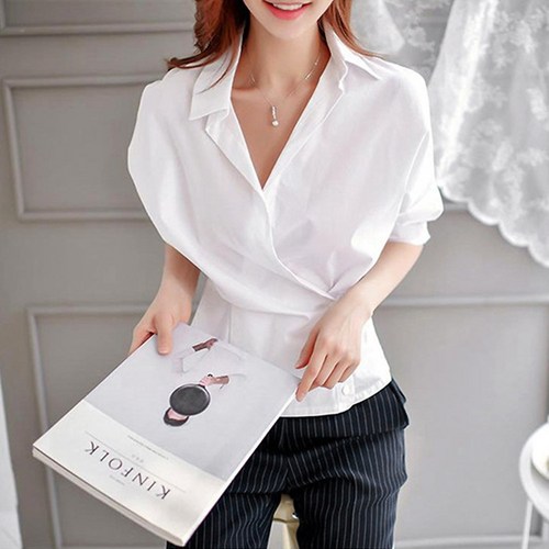 랩블라우스 반팔 여성 핀턱 카라 브이넥 페미닌룩
