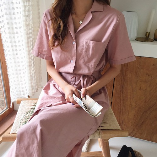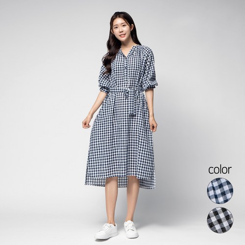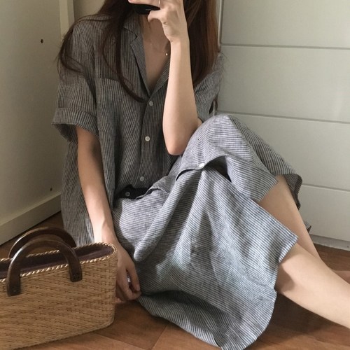 에이치스 소녀핏 체형커버 린넨 셔츠 반팔 롱원피스