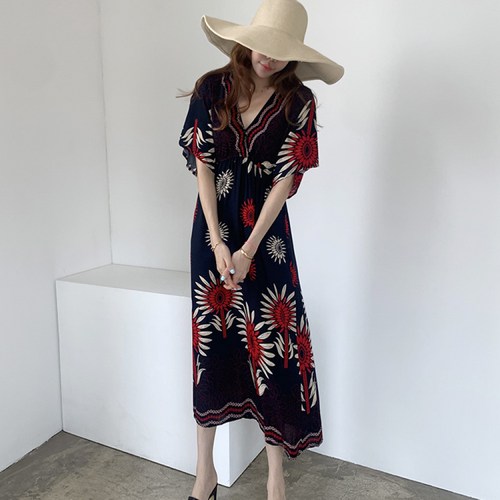 모니카앤아리 / 기획 브이넥 패턴 셔링 빅 플라워 에스닉 롱 원피스