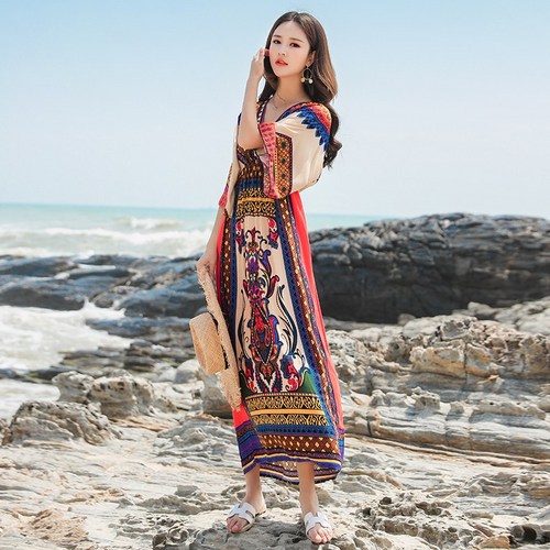 헤링본 롱 원피스 에스닉 보헤미안 반팔 비치웨어 휴양지 데일리 바캉스룩 H382