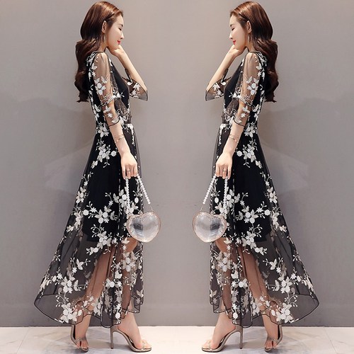 여성 여름 시스루 플라워 쉬폰 롱원피스