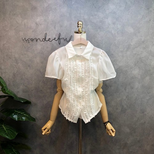 라임브릿지 하트 볼륨 카라 반팔 블라우스