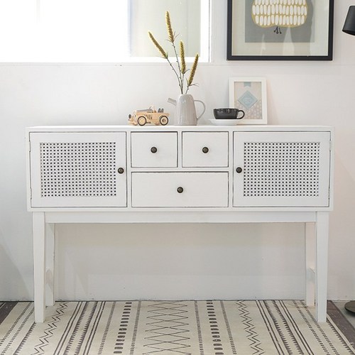 [디모토] 1200 라탄 콘솔 화장대 다용도 수납장 (화이트), 화이트