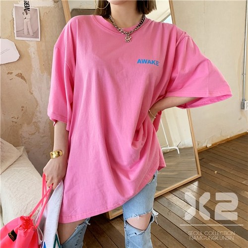 여름 반팔 티 루즈핏 형광펄톤 이니셜 옆트임