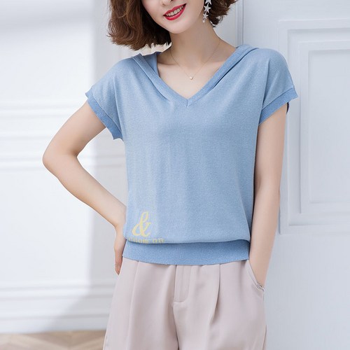 브이 넥 후드 반팔 티 여성 여름 얼음 실크 니트 상의 옷