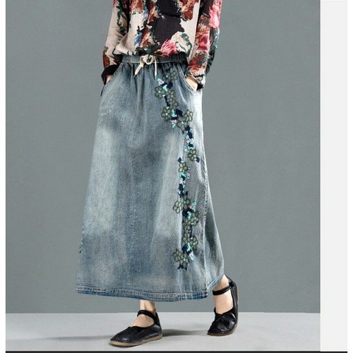 롱청치마 A라인 가을 데님 허리밴딩 꽃자수 청스커트