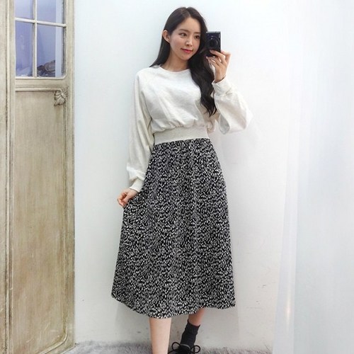 이힝 레오파드 a라인 스커트 밴딩 긴팔 롱원피스