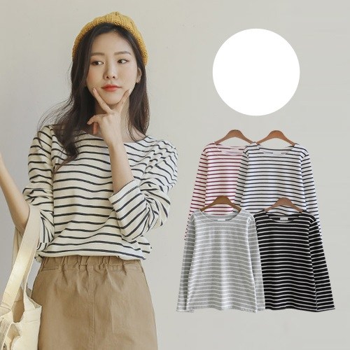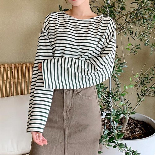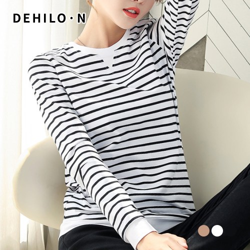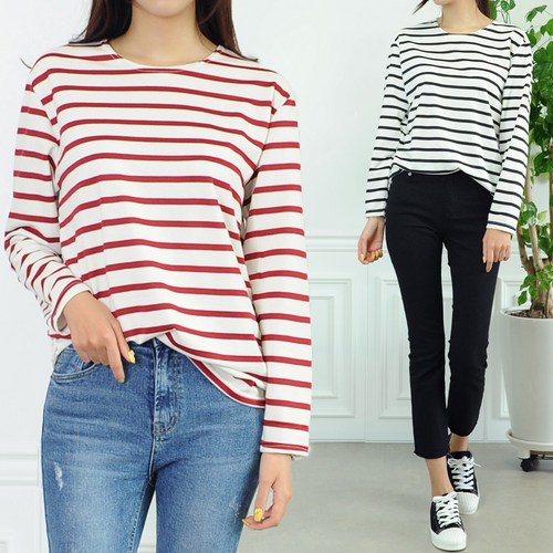 데일로엔 여성용 베이직 스트라이프 맨투맨 라운드넥 긴팔 티셔츠