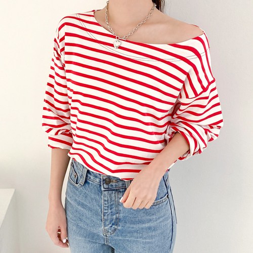 아모르데이 여성용 루즈핏 보트넥 미즈 스트라이프 긴팔 티셔츠