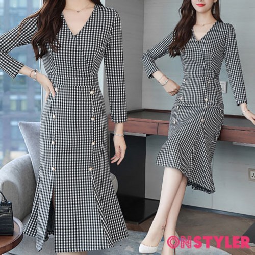 온스타일러 블랙슈가 트임 체크원피스 여성 가을 원피스 하객 롱원피스 정장