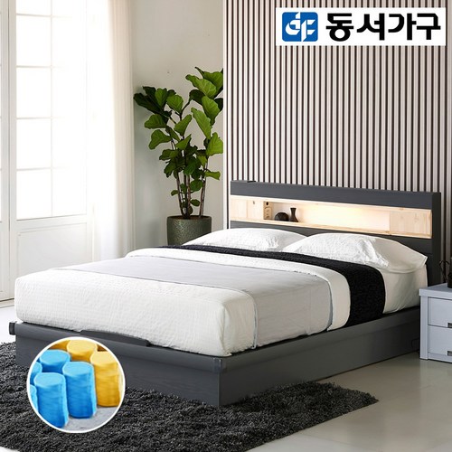 동서가구 세린 편백선반 LED 평상형 퀸 침대 (9존독립매트리스), 그레이