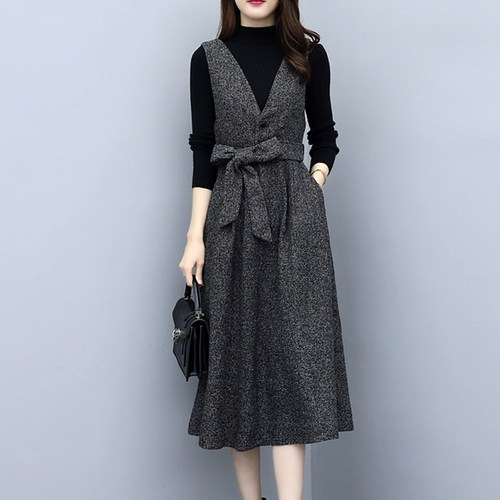 귀부인 가을옷 모직 멜빵 원피스 여성 작은 키 스트랩 허리보정 슬림핏 미디롱