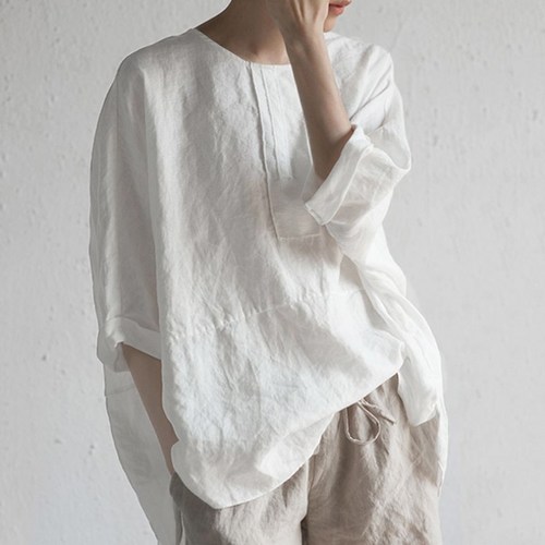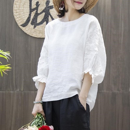 오버클래쓰 여성 7부 슬리브 자수 린넨 블라우스