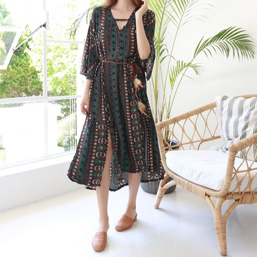 아티젠 바캉스룩 에스닉 V넥 롱원피스
