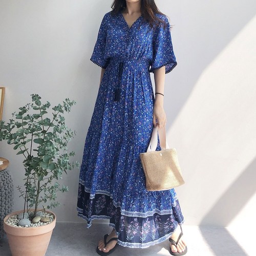 터치라인 넥트리 로브 에스닉 수술 반팔 비치 여름 롱원피스