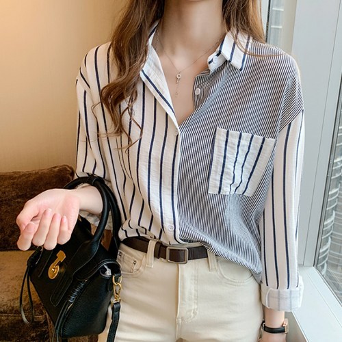 나바바 NB287 여성 린넨 스트라이프 긴팔 카라 셔츠