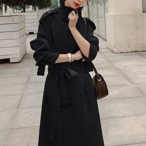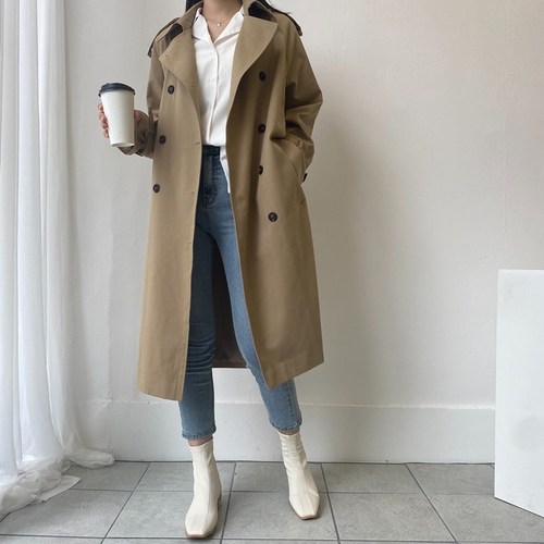 업쓰 여성 봄 가을 루즈 박시 오버핏 더블 단추 허리벨트 바바리 간절기 롱 카라 트렌치코트