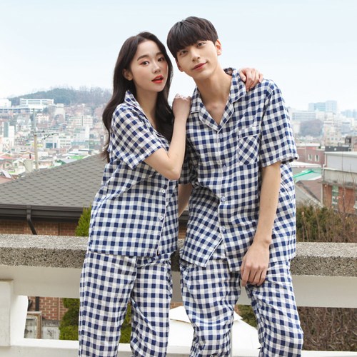 버블돌 커플용 홈웨어 지지미 스몰체크 반팔 투피스 잠옷 상하의 세트