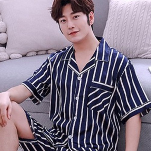 버블돌 커플용 홈웨어 지지미 줄무늬 반팔 투피스 잠옷 상하의 세트