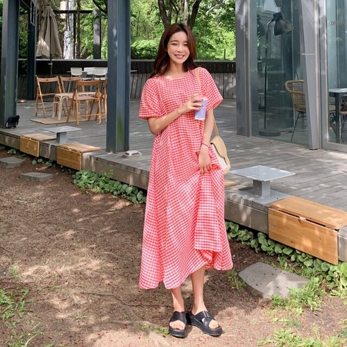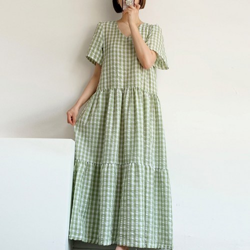 온샵 *당일출고*<주문폭주>지지미고방원단여름원피스 여성여름A라인반소매롱원피스 여성여름루즈핏체크주름롱원피스