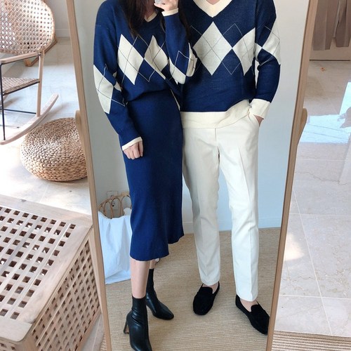 선남선녀 인디고 아가일 V넥니트 투피스 커플룩 커플시밀러룩