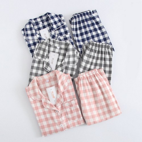 여성용 파스텔 와이드체크 숏슬리브 파자마 상하 세트