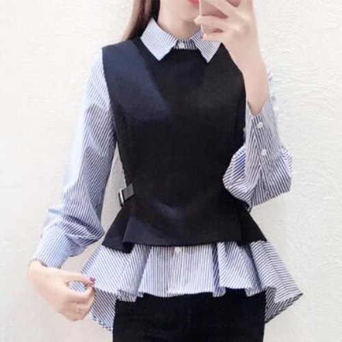 여성 스트라이프 언발 프릴 블라우스 검정 베스트 매치 봄 블라우스