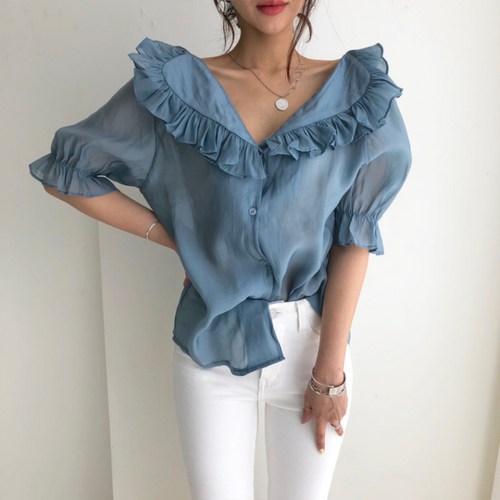 여성 V넥 오버프릴 레트로 쉬폰 숏 블라우스